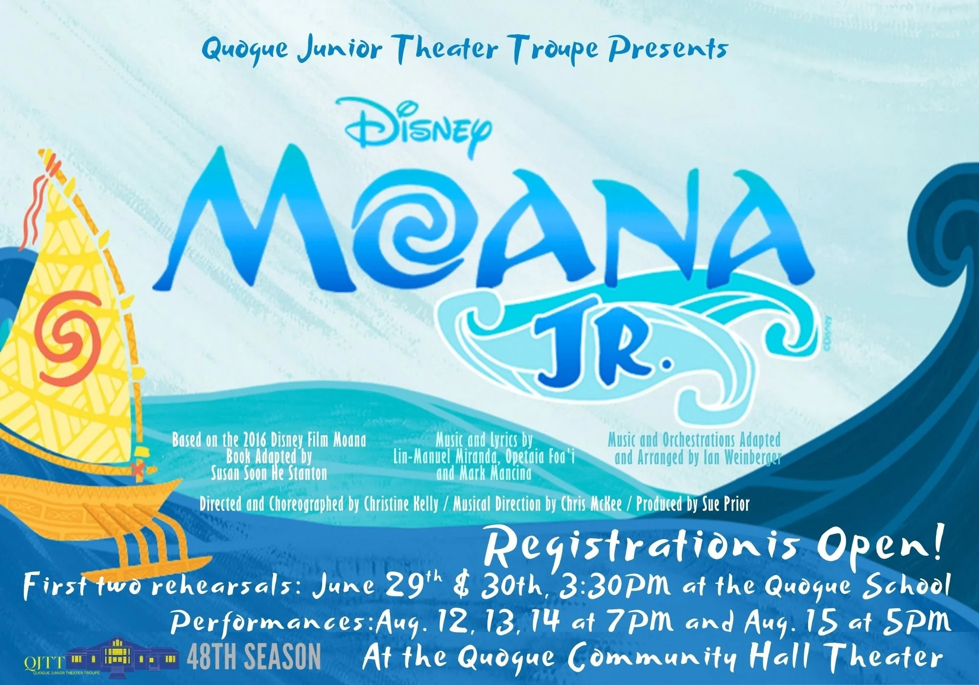 Rehearsals & Auditions: Begin Monday, June 29th, and Tuesday June 30th at 3:30PM at the Quogue Elementary School. Wednesday, Thursday and Friday, July 1st, 2nd and 3rd at 3:30PM, at the Quogue Community Hall Theater.